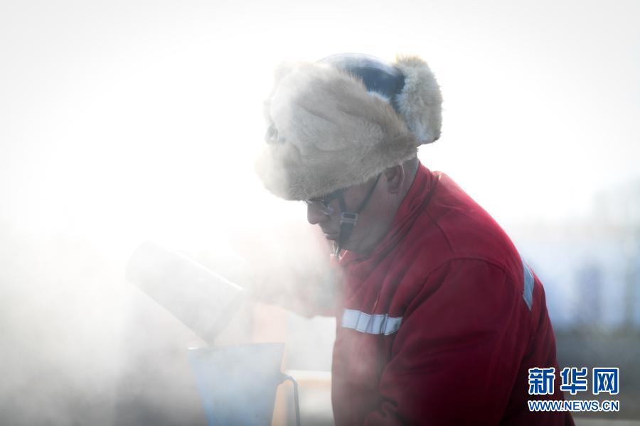 大庆油田1205钻井队钻井工人在野外钻井平台作业(2020年12月28日摄)。新华社记者 王松 摄