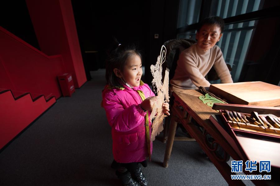 1月7日,在陕西西安明清皮影艺术博物馆,一名前来参观的小女孩拿起一幅先前雕刻好的皮影骨架。