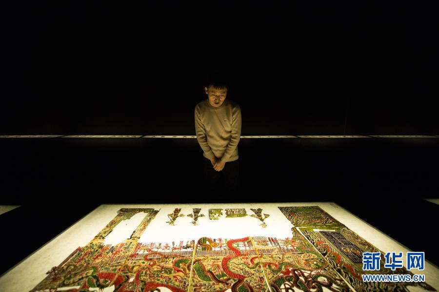 1月7日,在陕西西安明清皮影艺术博物馆,王可站在一幅展出的皮影文物前。新华社记者 魏翔 摄