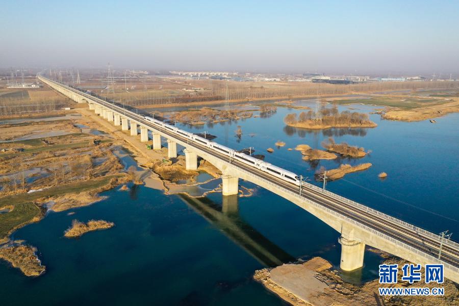 1月8日,运行试验动车组列车通过徐连高铁沂河特大桥(无人机照片)。