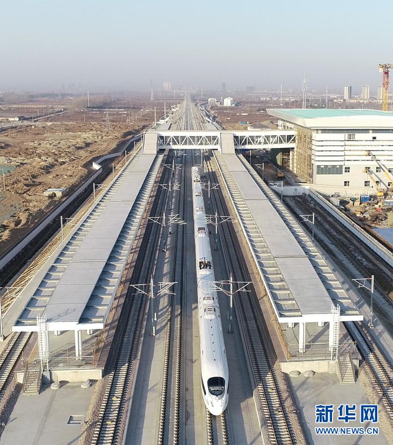 1月8日,运行试验动车组列车通过徐连高铁新沂南站(无人机照片)。
