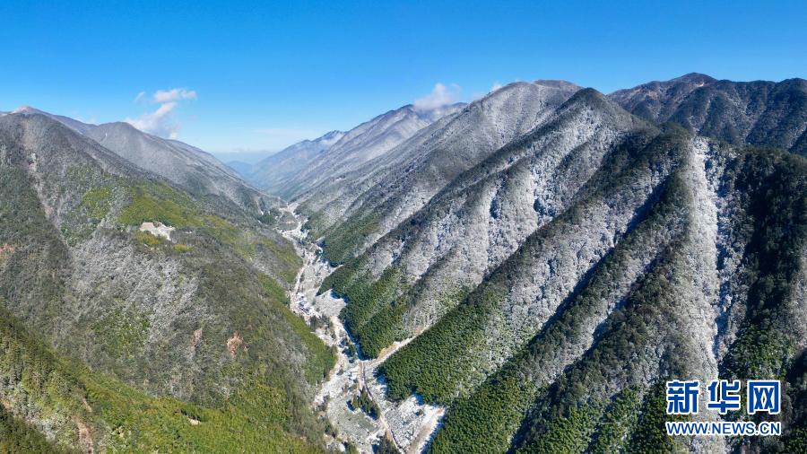 1月8日,武夷山国家公园腹地桐木关附近青山白雪相映成趣(无人机照片)。