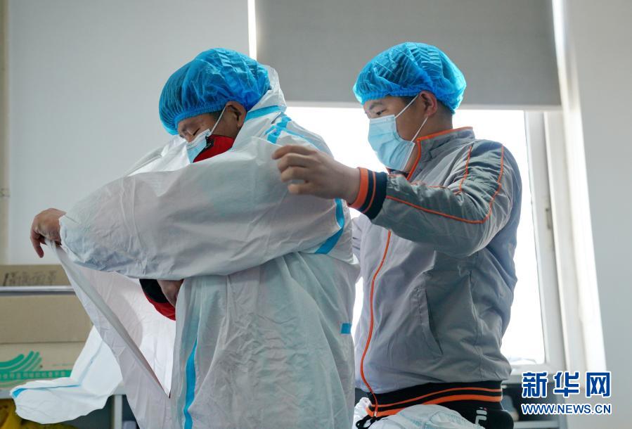 1月8日,梅乙奇(左)和同事左林在石家庄金域医学检验实验室内穿戴防护服。