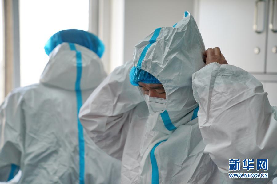 1月8日,梅乙奇在石家庄金域医学检验实验室内整理防护服。