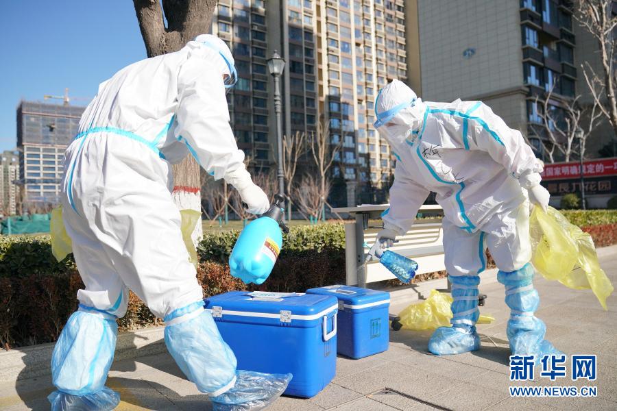 1月8日,在石家庄市一居民小区门外,梅乙奇(右)在给装有核酸样本的运输箱消毒。