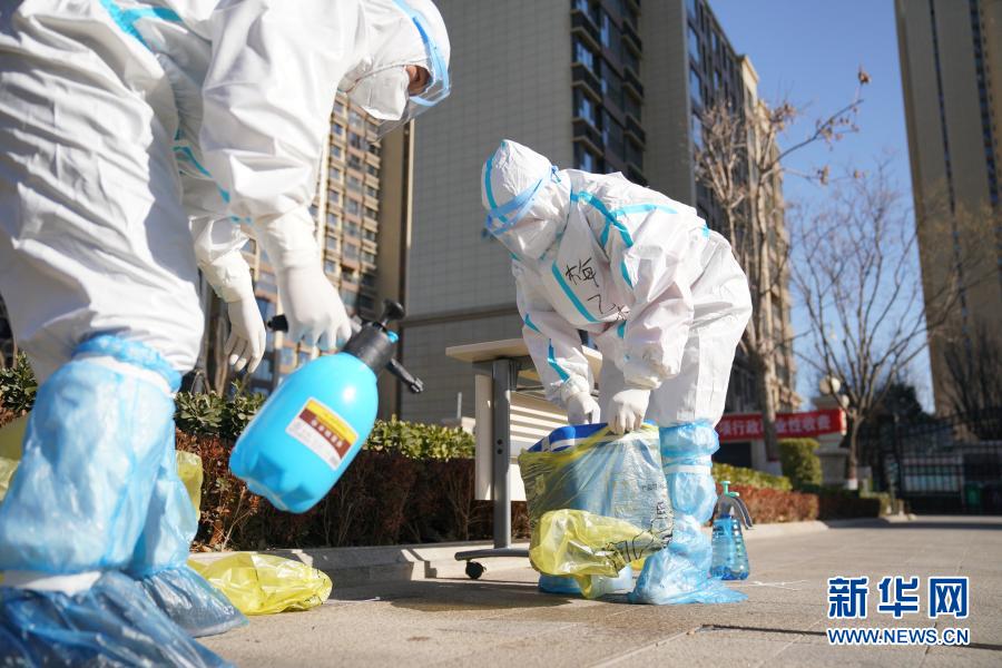 1月8日,在石家庄市一居民小区门外,梅乙奇(右)在包装装有核酸样本的运输箱。