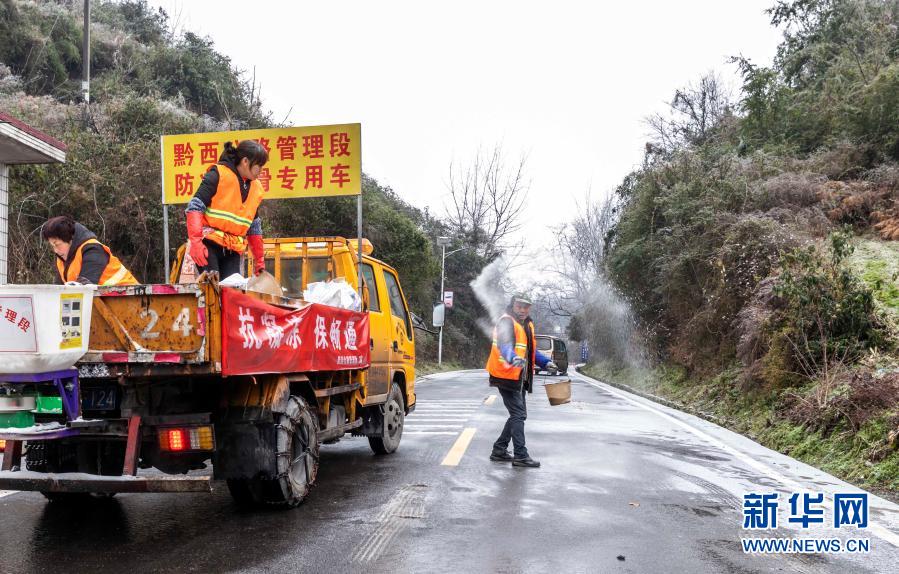 近日,受强冷空气影响,贵州省多地出现雨雪天气和道路凝冻情况。贵州省交通路政、交警等部门开展道路撒盐除冰作业,对车辆进行管控分流,全力保障道路安全通畅。