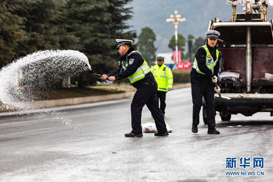 近日,受强冷空气影响,贵州省多地出现雨雪天气和道路凝冻情况。贵州省交通路政、交警等部门开展道路撒盐除冰作业,对车辆进行管控分流,全力保障道路安全通畅。