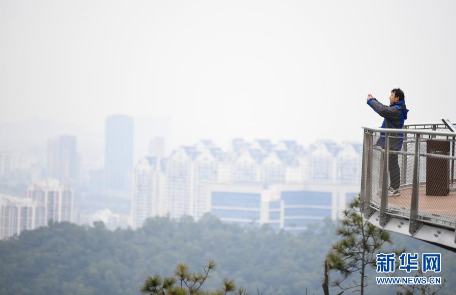 1月8日,工作人员在珠海板樟山步道拍照。新华社记者 邓华 摄