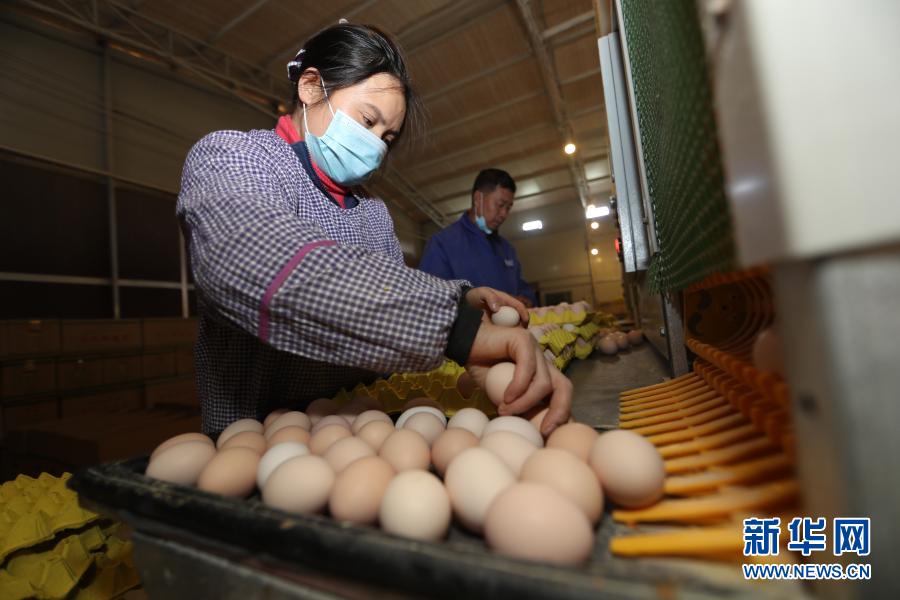 1月8日,在贵州省铜仁市大龙经济开发区一家蛋鸡养殖企业,工作人员在蛋鸡养殖场收鸡蛋。