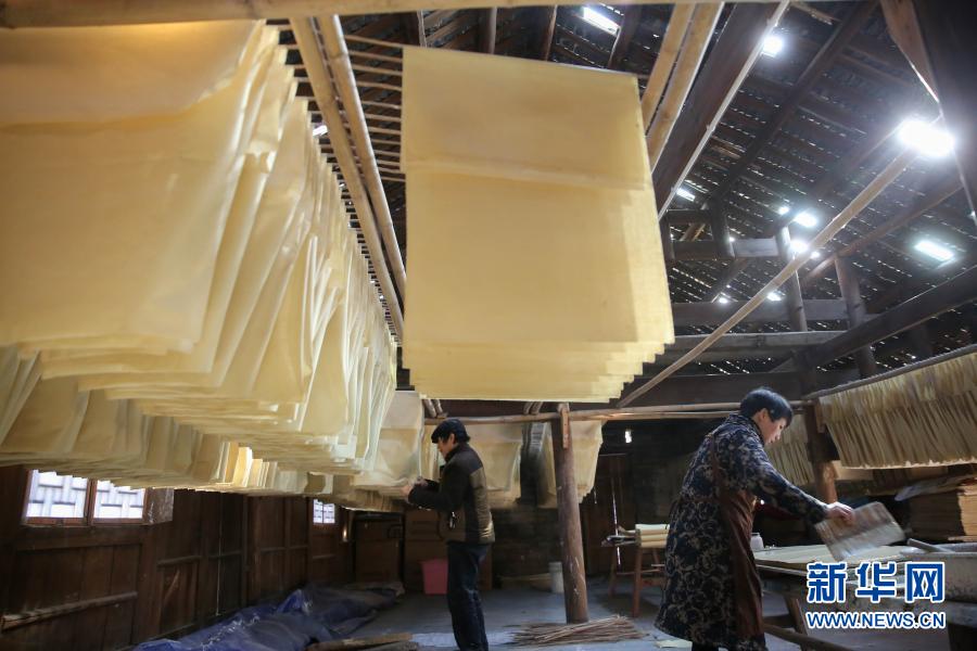 1月8日,在湖南省邵阳市隆回县滩头镇福美祥年画作坊,滩头木版年画艺人尹冬香(右)在刷纸。新华社发(曾勇 摄)