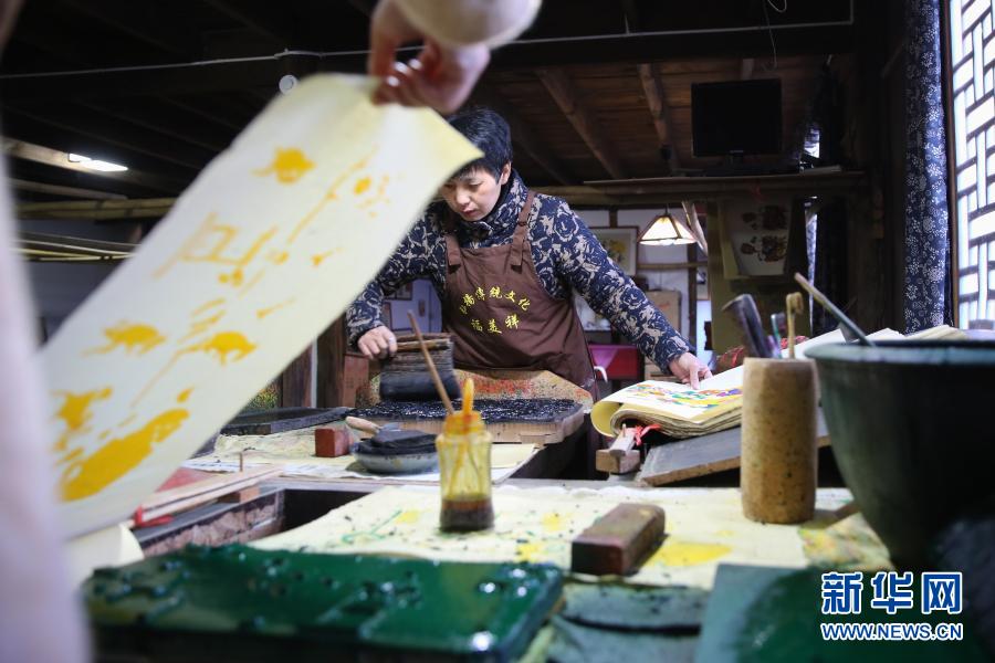 1月8日,在湖南省邵阳市隆回县滩头镇福美祥年画作坊,滩头木版年画艺人尹冬香在印制滩头年画。新华社发(曾勇 摄)