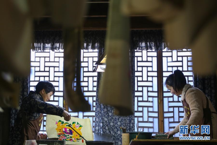 1月8日,在湖南省邵阳市隆回县滩头镇福美祥年画作坊,滩头木版年画艺人尹冬香(左)和女儿肖扬在印制滩头年画。新华社发(曾勇 摄)