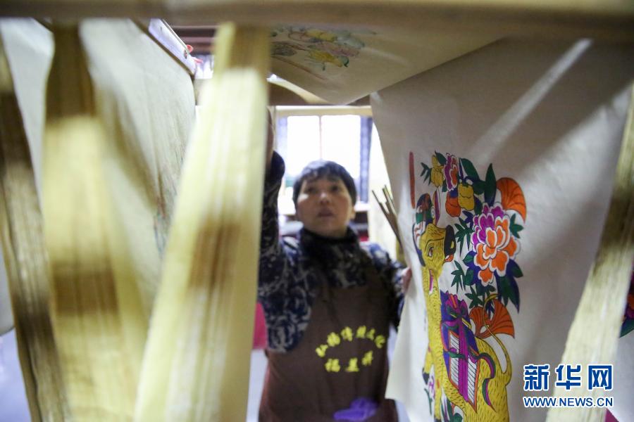 1月8日,在湖南省邵阳市隆回县滩头镇福美祥年画作坊,滩头木版年画艺人尹冬香在晾晒年画。新华社发(曾勇 摄)