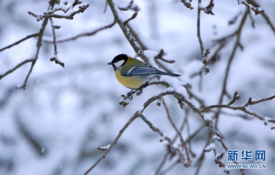 1月8日,在白俄罗斯首都明斯克,一只鸟站在落有积雪的树枝上。