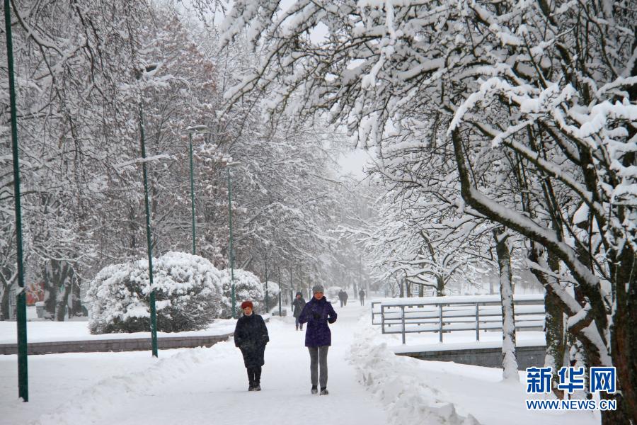 1月8日,在白俄罗斯首都明斯克,行人在公园内积雪的道路上行走。新华社发(任科夫摄)