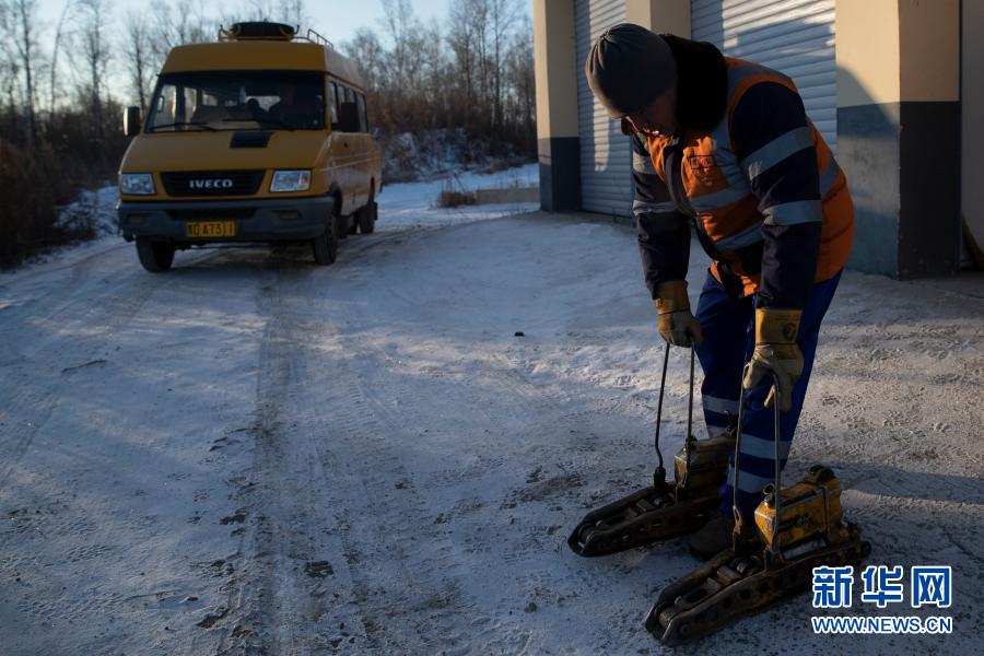 1月8日,在抚远线路工区内,王旭东出发前检查设备。新华社发(张涛摄)