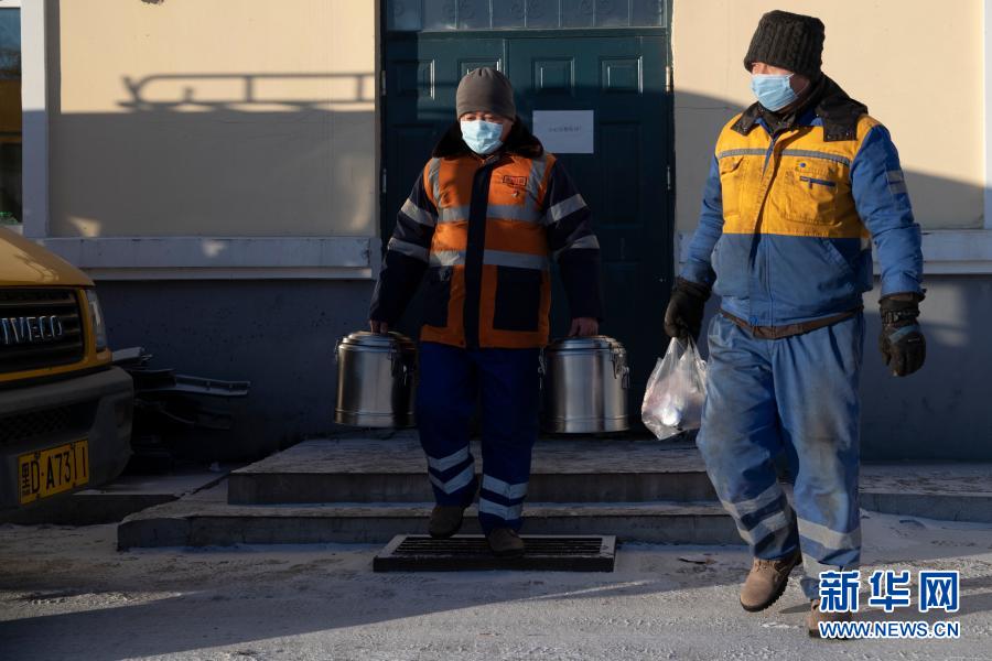 1月8日,王旭东(左)和工友从抚远线路工区职工宿舍里取出保温饭桶。新华社发(张涛摄)