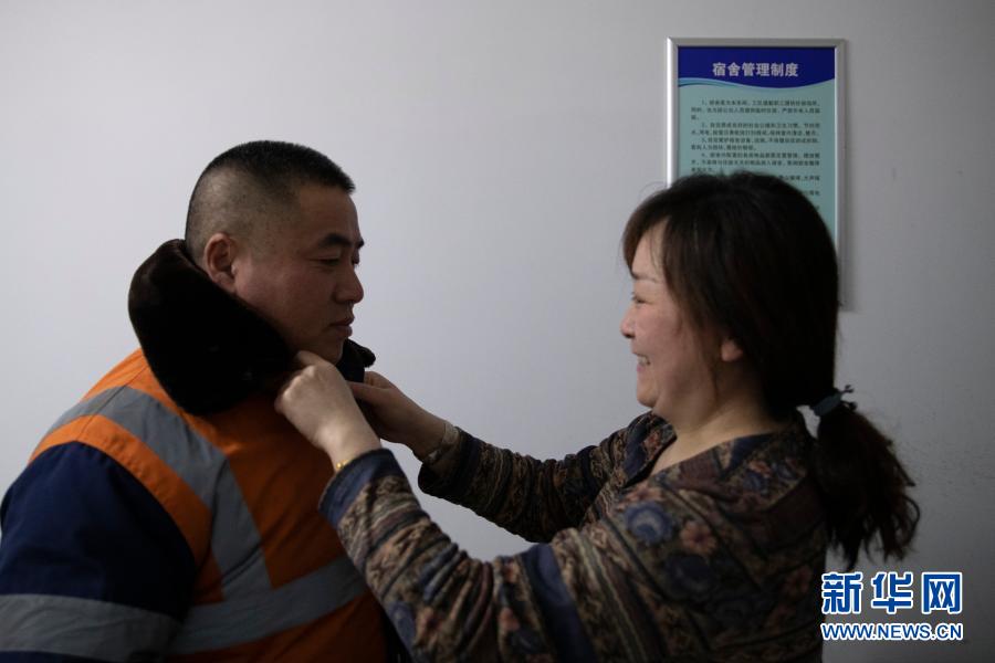 1月8日,在抚远线路工区职工宿舍,王旭东的爱人帮他穿上工服。新华社发(张涛摄)