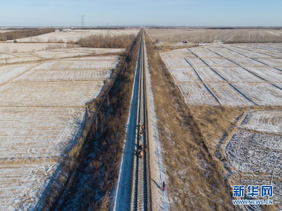 1月8日,王旭东和工友在抚远线路工区进行线路维修作业(无人机照片)。新华社发(张涛摄)