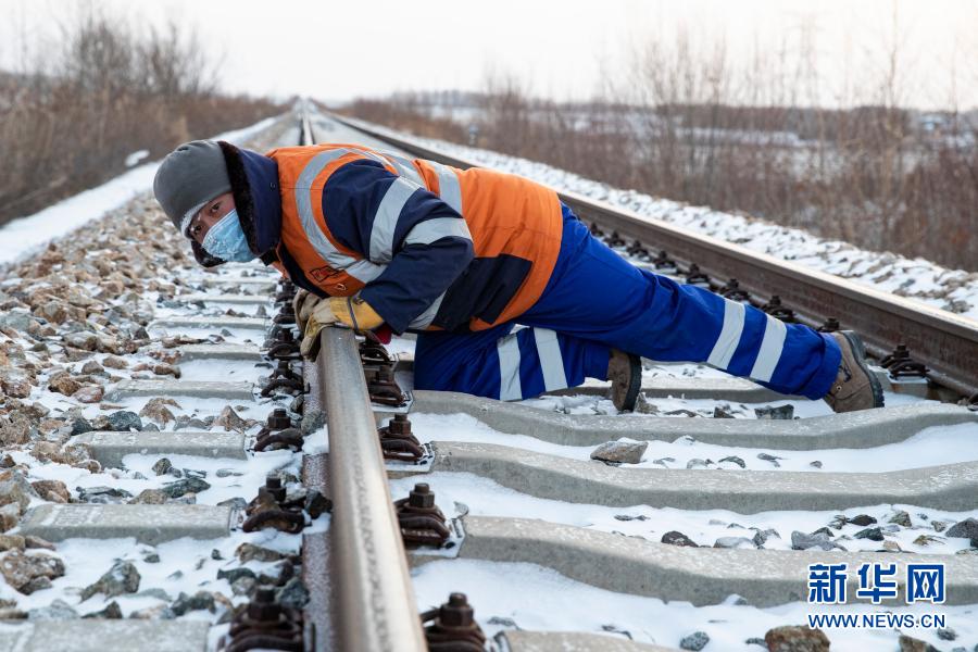 1月7日,在抚远线路工区前抚线铁路122公里处,王旭东趴在铁道线上观察线路高低。新华社发(张涛摄)
