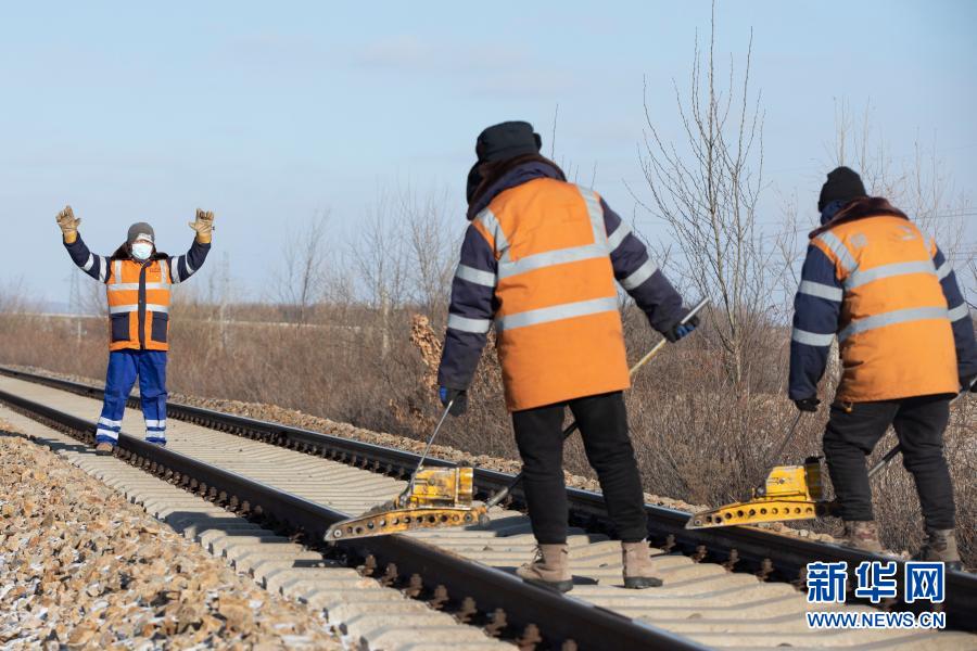 1月8日,在抚远线路工区前抚线铁路122公里处,王旭东(左一)和工友通过指挥手语进行沟通。新华社发(张涛摄)