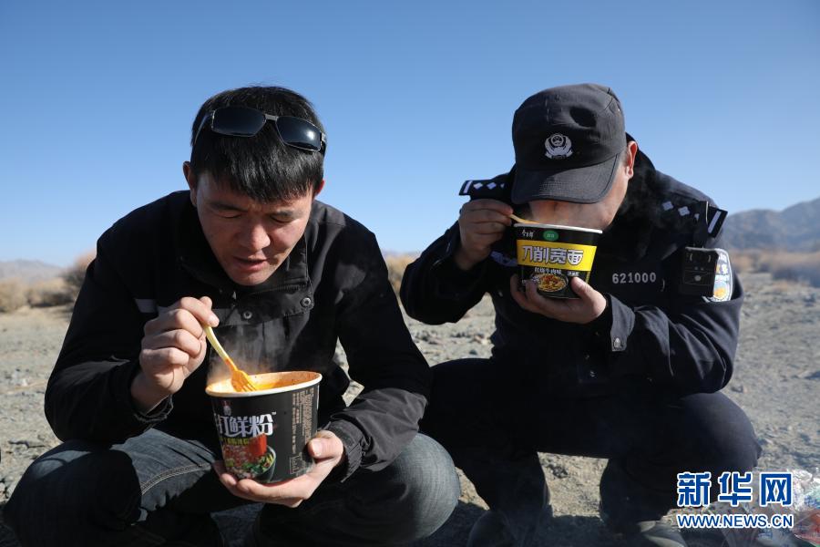 1月8日,安南坝分局民警在巡逻途中吃午饭。新华社记者 杜哲宇 摄