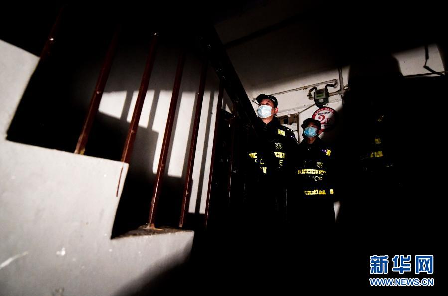 长春市公安局重庆路派出所所长白鑫宇(左)、民警王广辉(中)、辅警李毅(右)在夜巡中接到警情,来到辖区内一栋居民楼内调解邻里纠纷(1月6日摄)。
