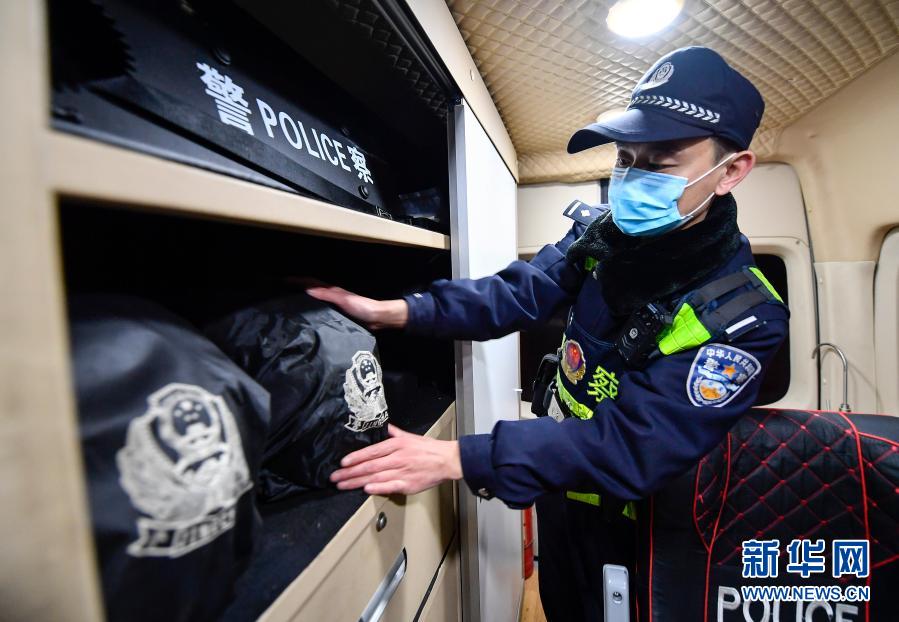 长春市公安局重庆路派出所民警王广辉整理巡逻车上的装备(1月6日摄)。