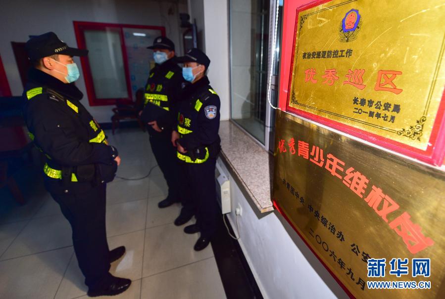 长春市公安局重庆路派出所所长白鑫宇(左)在执行夜巡任务前叮嘱民警王广辉(右一)、辅警李毅(右二)需注意的事项(1月6日摄)。