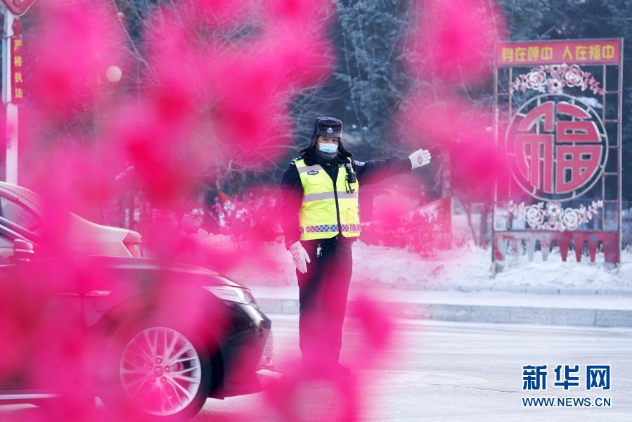 在呼中区的一处十字路口,孙臣在指挥交通(1月8日摄)。