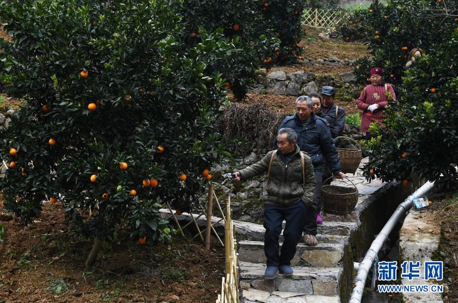 1月7日,毛相林(前)和下庄村村民们前往柑橘种植地里采摘柑橘。新华社记者 王全超 摄