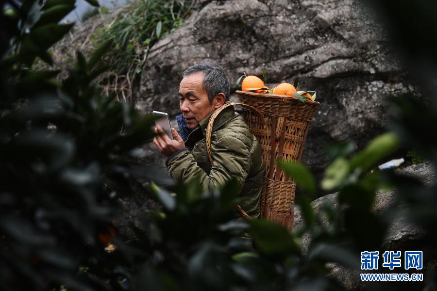 1月7日,毛相林在背运柑橘途中歇息时与水果商沟通。新华社记者 王全超 摄