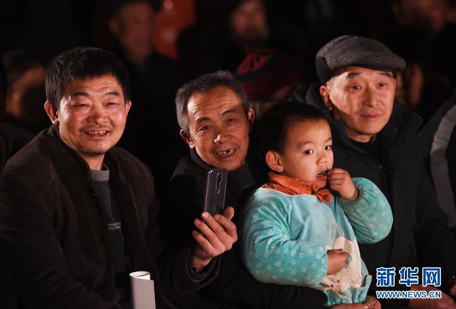 1月6日,毛相林(左二)和下庄村村民们一起观看由巫山县文化馆组织的慰问演出。新华社记者 王全超 摄