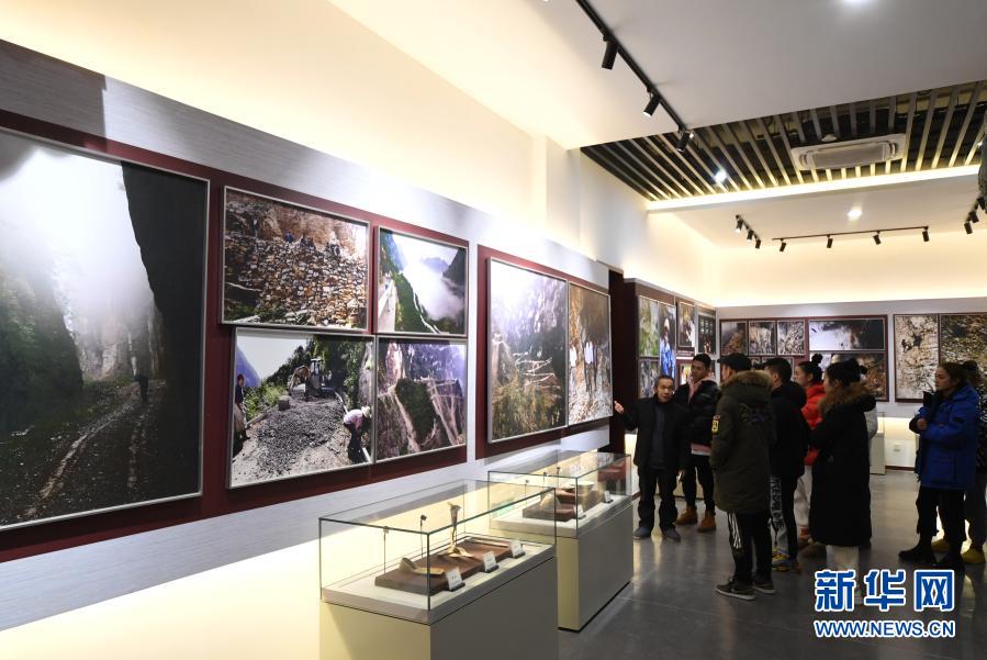 1月6日,毛相林(左一)在下庄精神陈列馆内向观众讲述当年修路的故事。新华社记者 王全超 摄