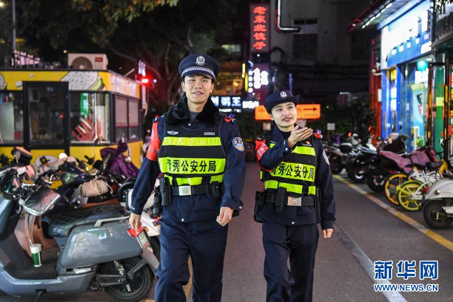 2021年1月8日晚,蒋兰(右)和同事一起在辖区内巡逻。