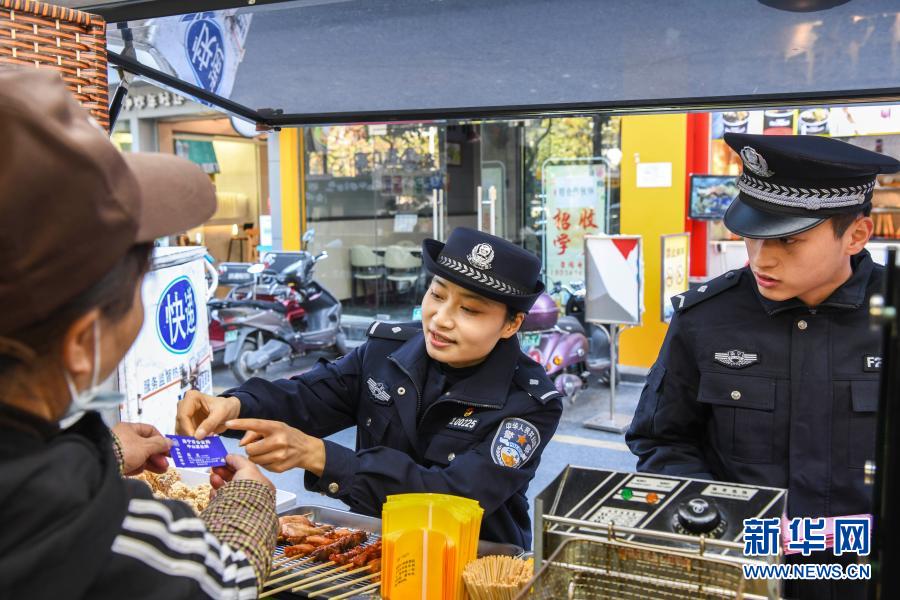 2020年12月31日,在南宁市青秀区桃源南社区,蒋兰(右二)向商户发放写有自己电话的警务联系卡片。新华社记者 刘岭逸 摄