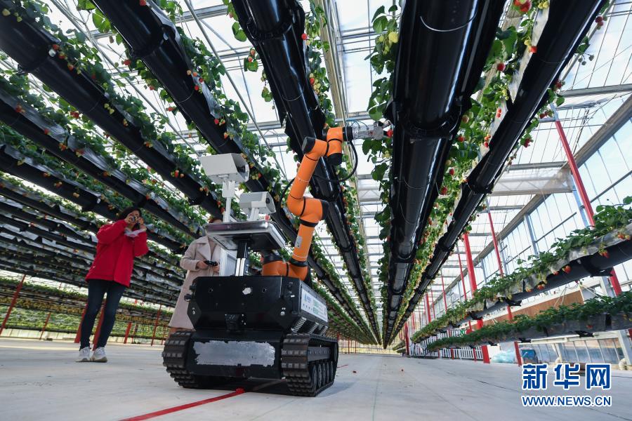 1月9日,在建德市杨村桥镇草莓小镇示范园区草莓大棚内,新研发的草莓采摘机器人伸出机械臂,根据程序设置采摘成熟的草莓。新华社记者 徐昱 摄