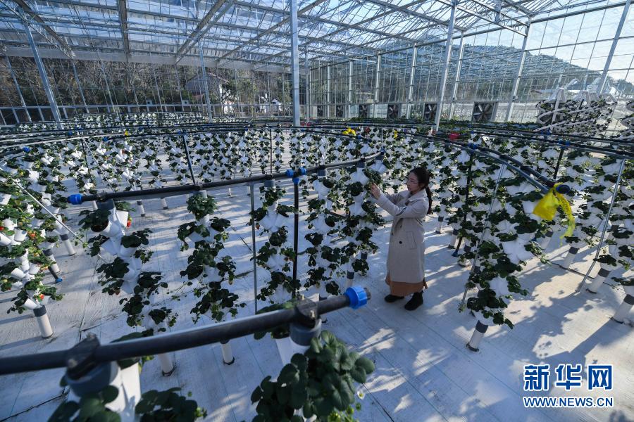 1月9日,在建德市杨村桥镇草莓小镇示范园区,工作人员在温室大棚内采摘立体栽培的草莓。新华社记者 徐昱 摄