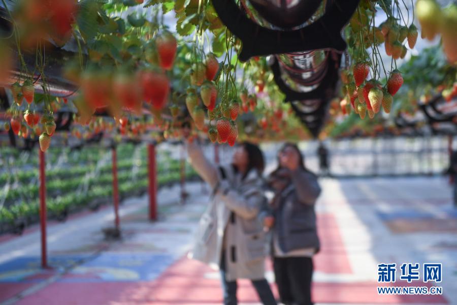 1月9日,在建德市杨村桥镇草莓小镇示范园区草莓大棚内,游客在采摘草莓。新华社记者 徐昱 摄