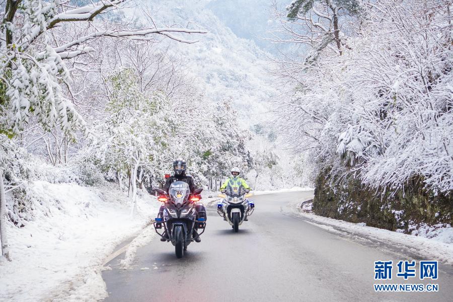 浙江省绍兴市新昌县公安局铁骑中队民警在儒岙镇会墅岭路段巡逻,提醒过往车辆雪后减速慢行(2020年12月15日摄)。