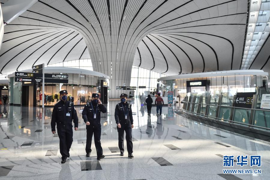 北京大兴机场民警在航站楼里执勤(2020年2月1日摄)。