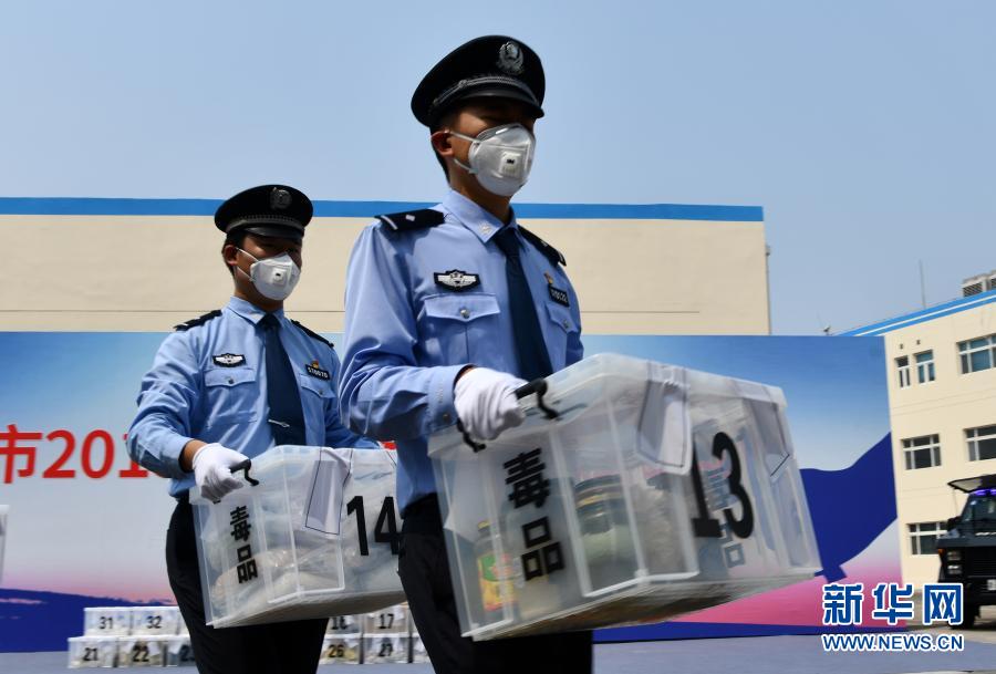 在天津市2019年集中销毁毒品活动现场,警察将毒品搬送到销毁炉处(2019年6月26日摄)。