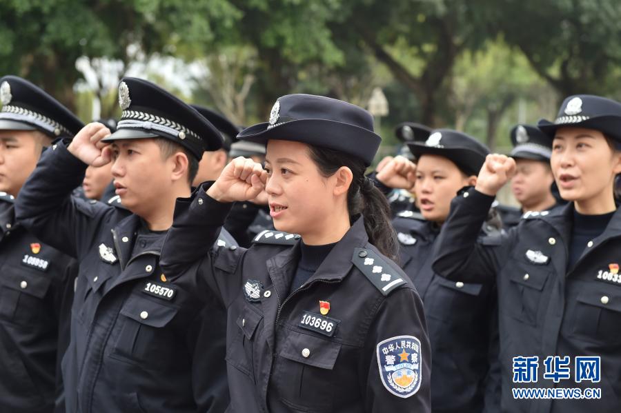 在广西南宁市公安局青秀分局中山派出所,民警在重温入警誓词(2021年1月6日摄)。