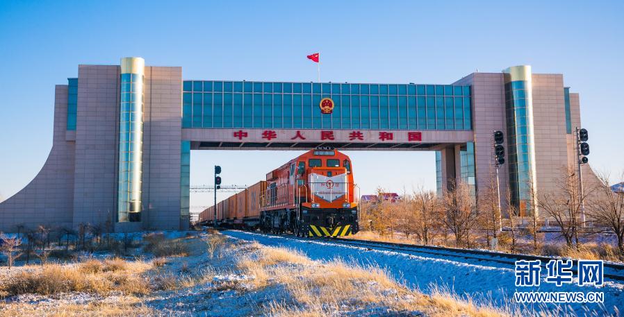 1月8日,一列中欧班列完成边防检查后驶出二连浩特国门。新华社发(郭鹏杰 摄)