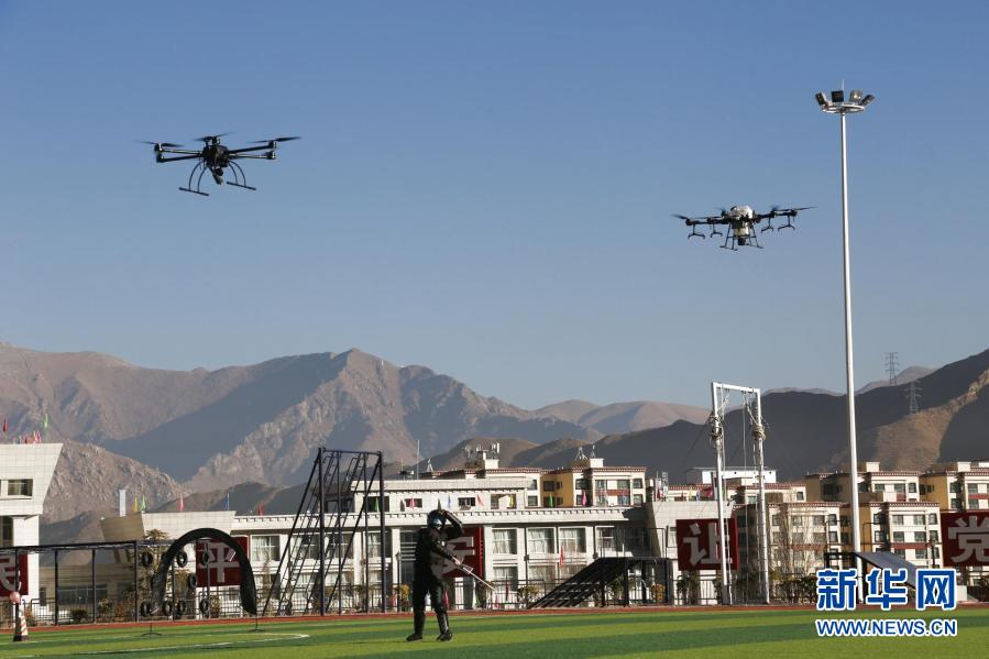 这是在拉萨市公安局特警支队举办的警营开放日活动上拍摄的对抗无人机联合作战演示(1月8日摄)。新华社记者 张兆基 摄