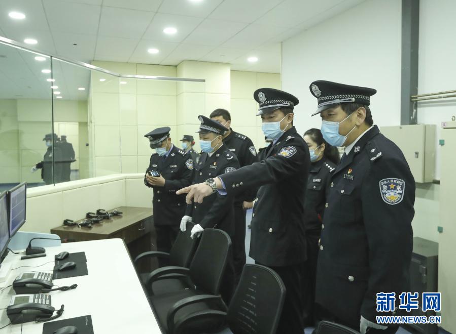司法警察参观北京高院法警总队“六专四室”中的监控室(1月8日摄)。