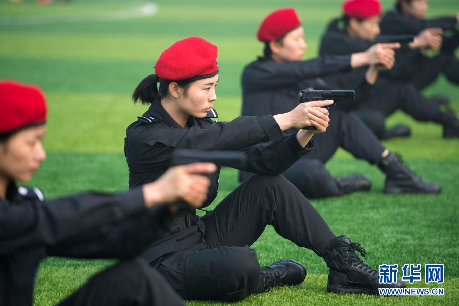 2017年3月7日,武汉女子特警大队的队员进行持枪战术训练。