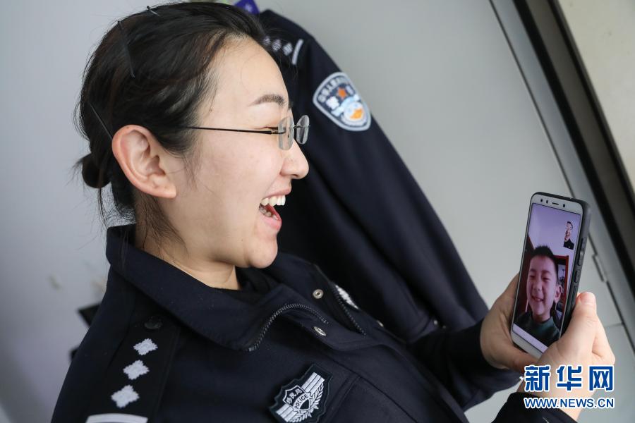 2020年3月6日,青岛机场出入境边防检查站执勤七队民警于笑鹃与远在德州老家父母处寄住的儿子视频通话。口岸国门疫情防控任务艰巨、情况复杂,为了避免自身职业风险给家人带来感染隐患,许多女警将孩子送到远方的父母家寄住,每天仅通过手机视频与亲人传递思念。