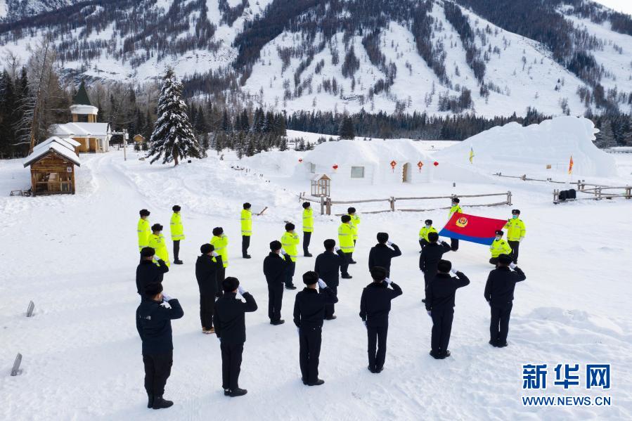 2021年1月9日,新疆阿勒泰地区喀纳斯景区公安局民警列队向中国人民警察警旗敬礼。